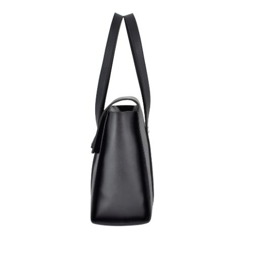 The upright silhouette keeps the bag standing firmly on its own, while the vertical strap detailing and polished rivets offer a sleek and modern look. Twin handles provide a comfortable shoulder carry, and the interior is roomy enough for laptops, notebooks, makeup pouches, and more.